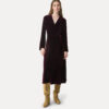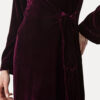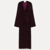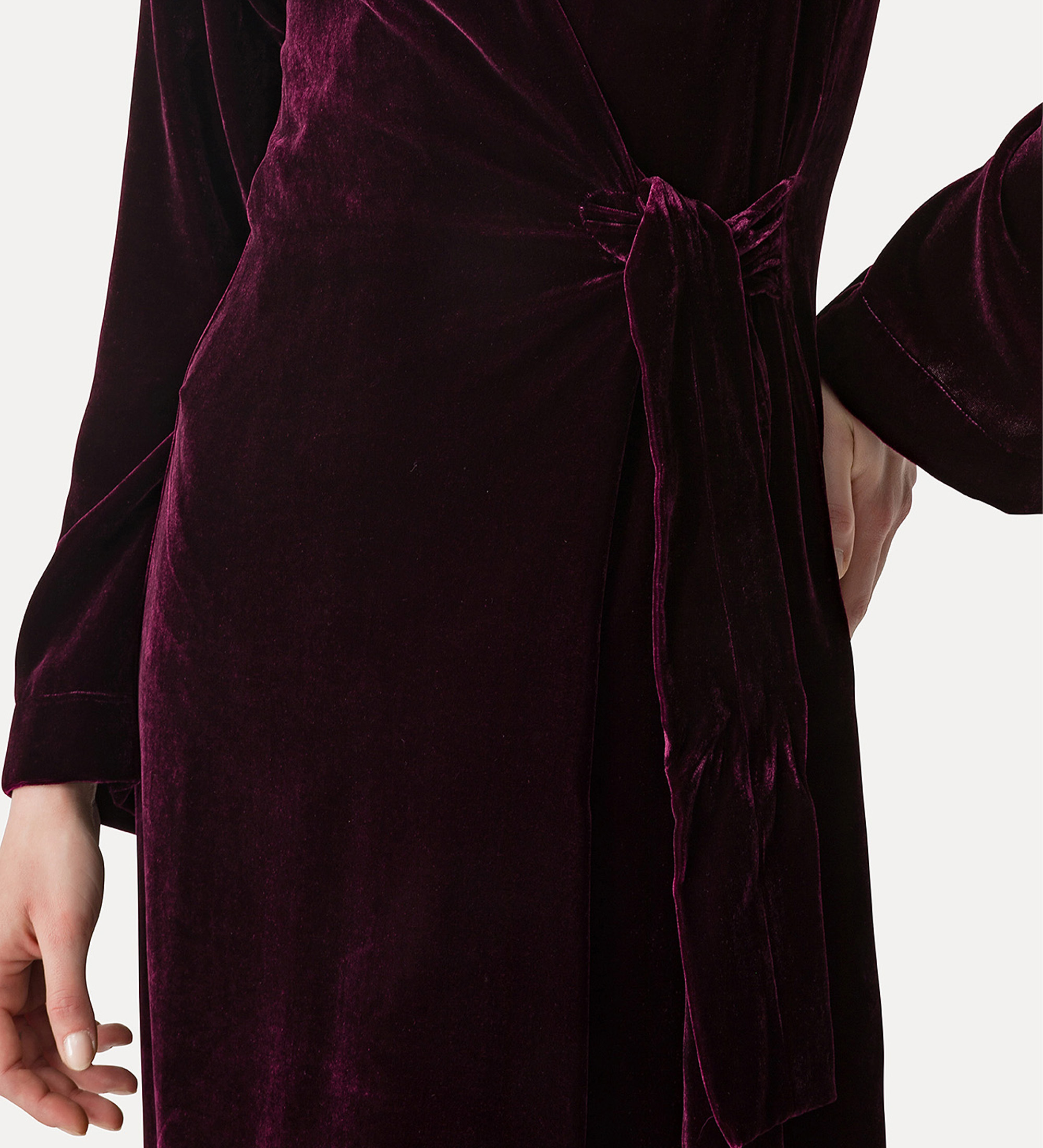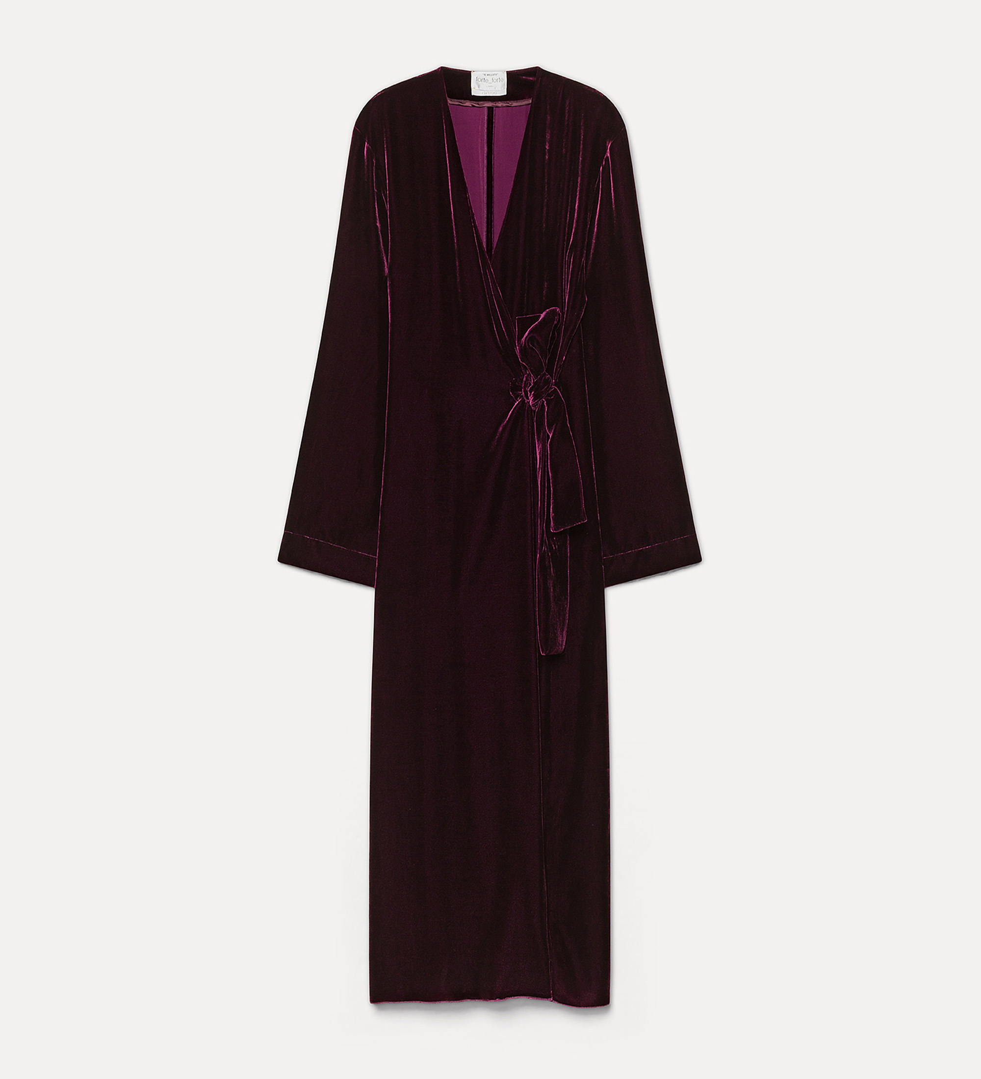 sofisticato e ricco nelle finiture, l’abito midi incrociato in velluto liscio carezza la pelle e la illumina con la sua delicata finitura cangiante. fissato da fusciacca in vita, disegna elegantemente la silhouette e avvolge il corpo. si può indossare anche aperto, come spolverino, in un sofisticato gioco di sovrapposizioni