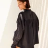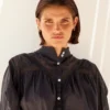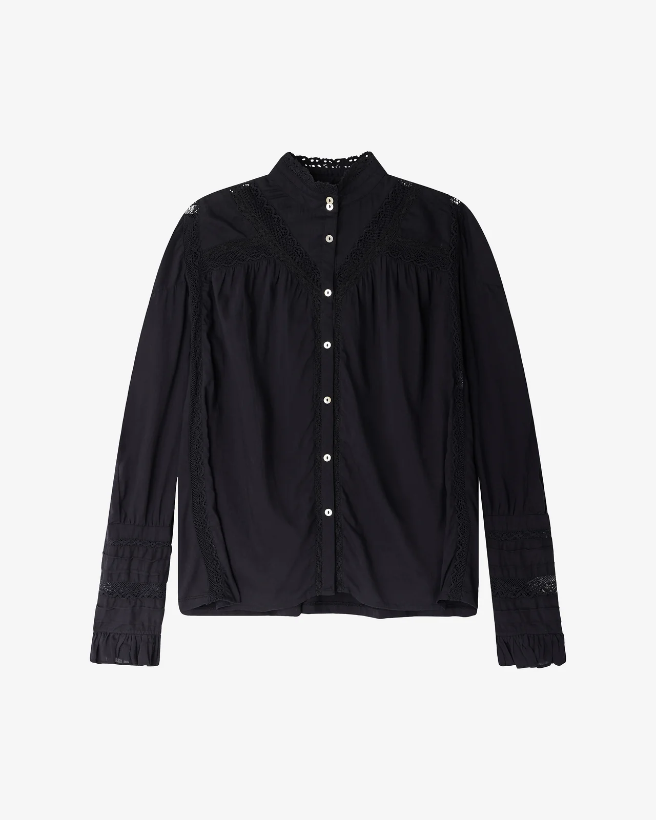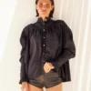 Un tocco di delicato romanticismo. Realizzata in cotone nero, la nostra blusa evoca l’eleganza di una silhouette di ispirazione vittoriana, reinterpretata in chiave moderna. Un pizzo pregiato impreziosisce spalle e polsini, accentuato da piccole e leggere balze che aggiungono consistenza e morbidezza. Il colletto alto in stile crochet esalta l’aspetto raffinato del capo, mentre la vestibilità comoda e la chiusura frontale con bottoni garantiscono comfort e praticità nell’uso quotidiano.