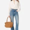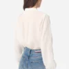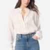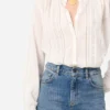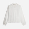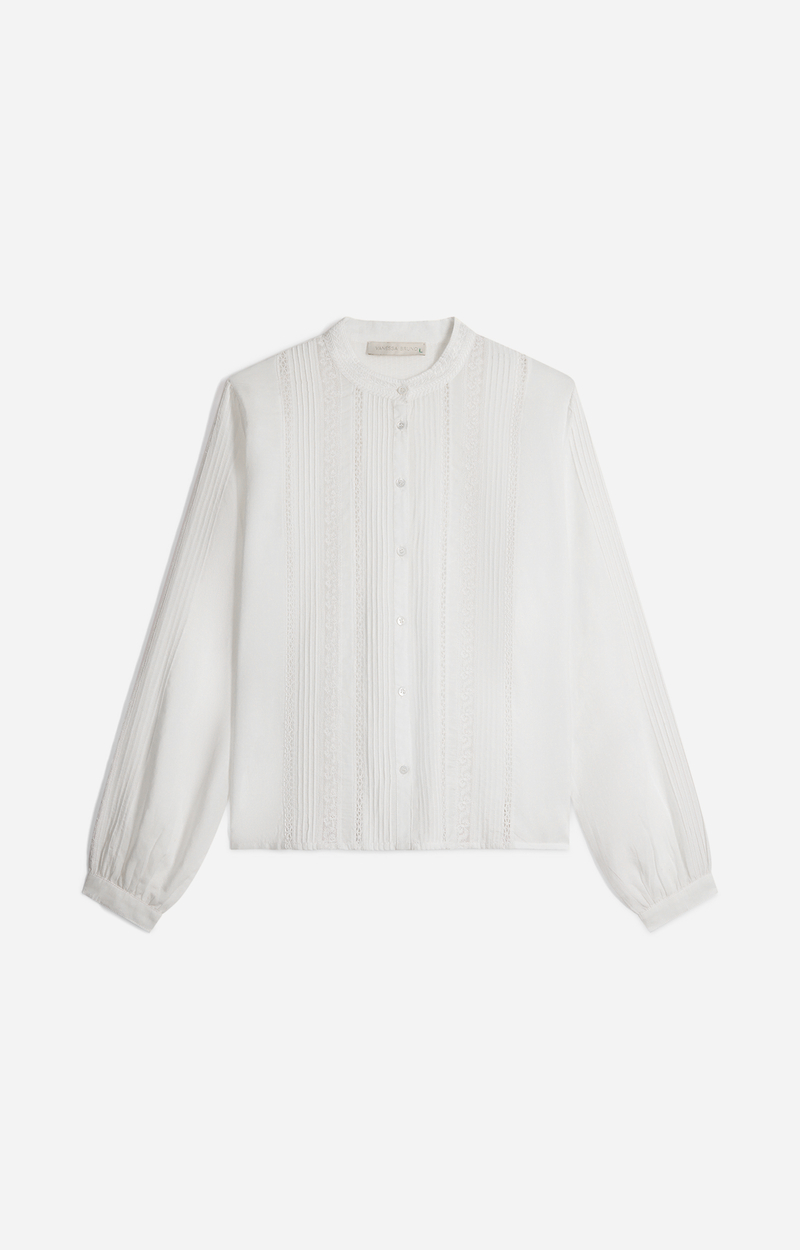 Blusa fluida in cotone, con inserti in pizzo e plissettature sul davanti dallo spirito romantico, polsi abbottonati e collo alla coreana.