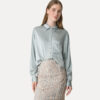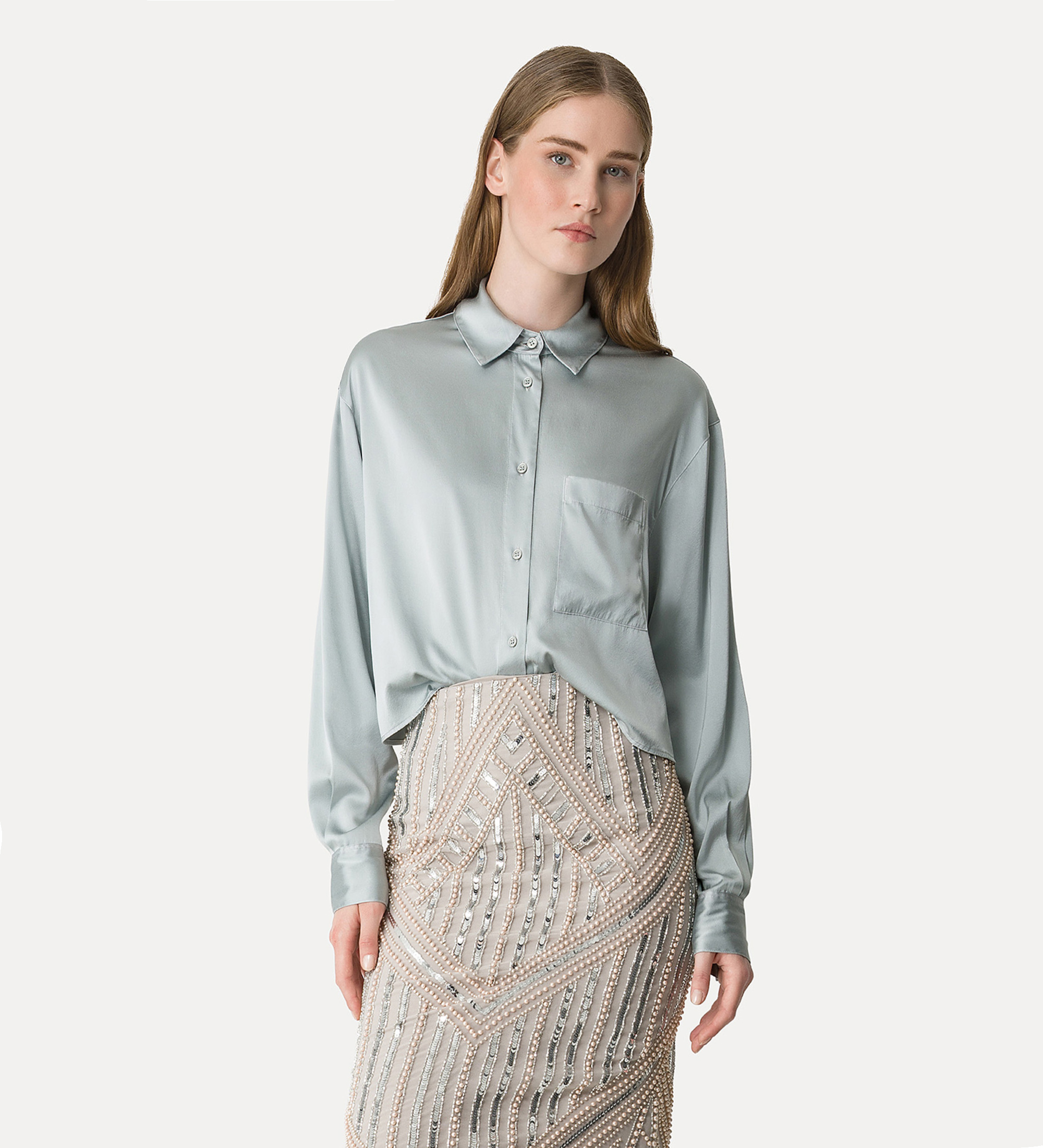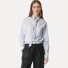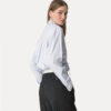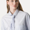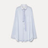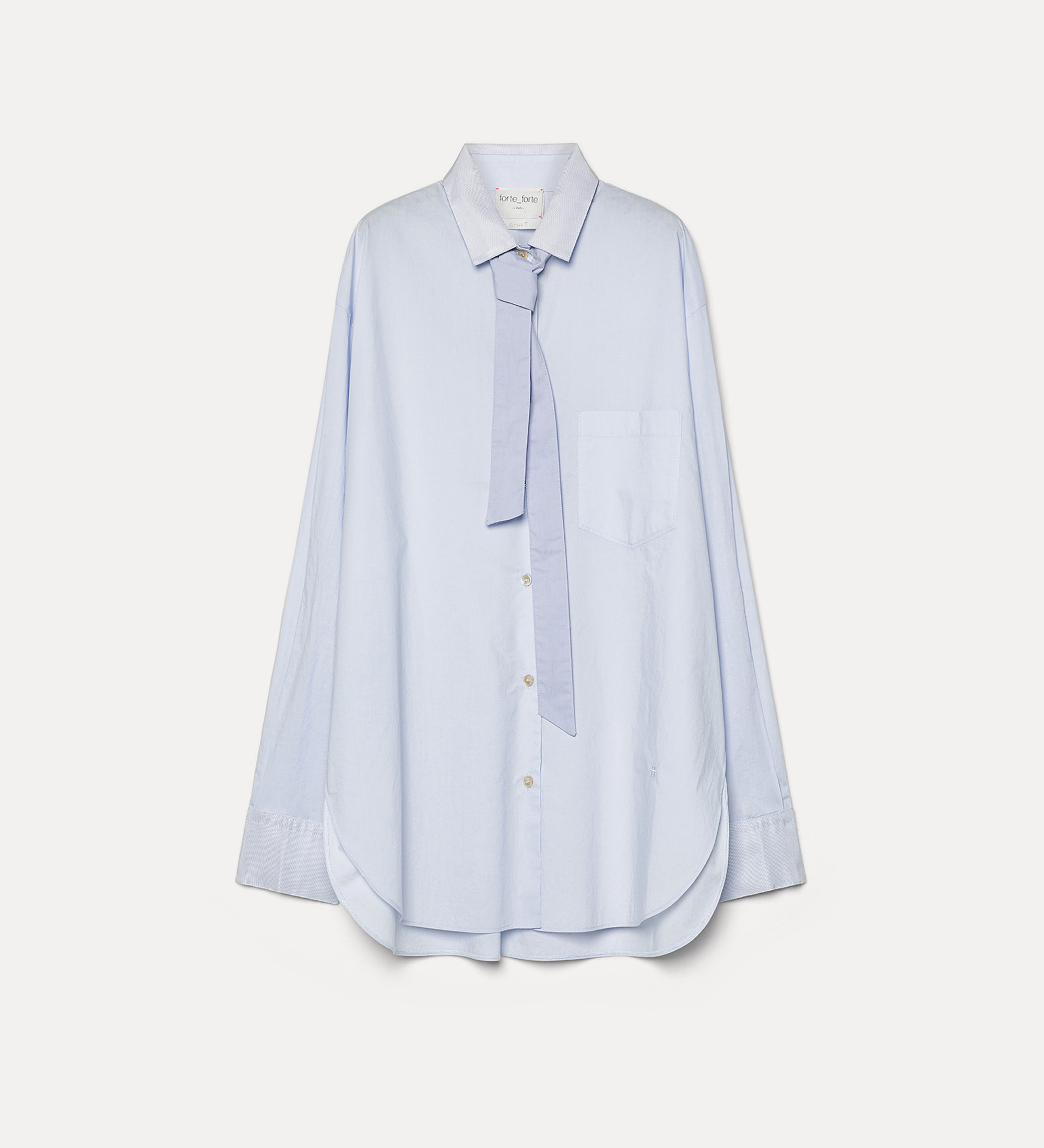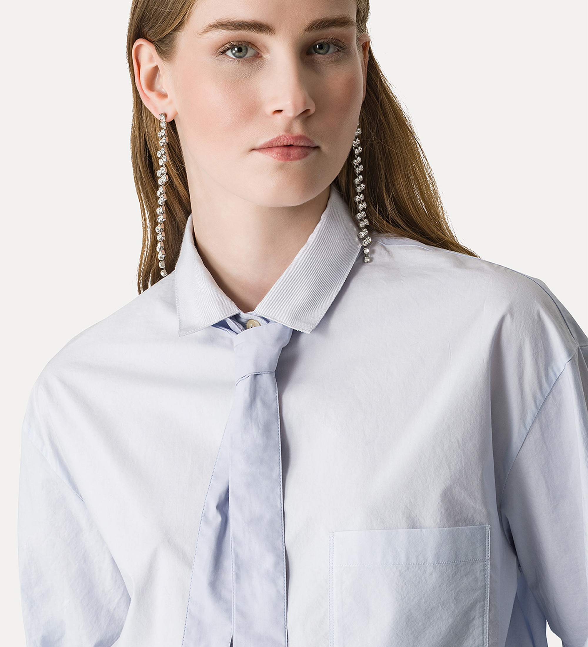 rigore e femminilità si incontrano nella camicia oversize in popeline di cotone, con taglio essenziale e moderno. i dettagli in gros grain tono su tono rifiniscono con precisione collo e polsi, mentre il cravattino nello stesso tessuto aggiunge un gesto sartoriale di grande impatto. il fondo asimmetrico con spacchi stondati invitano a un layering sofisticato.