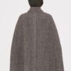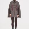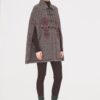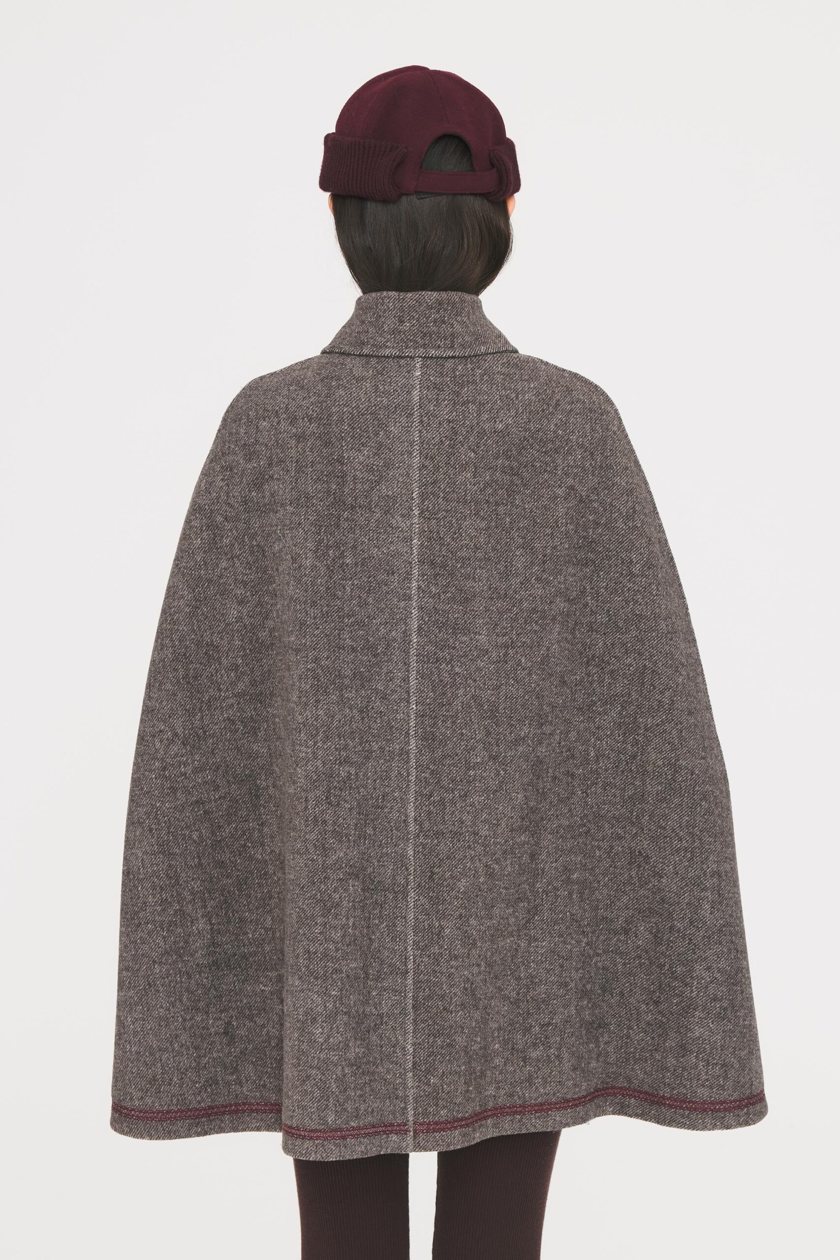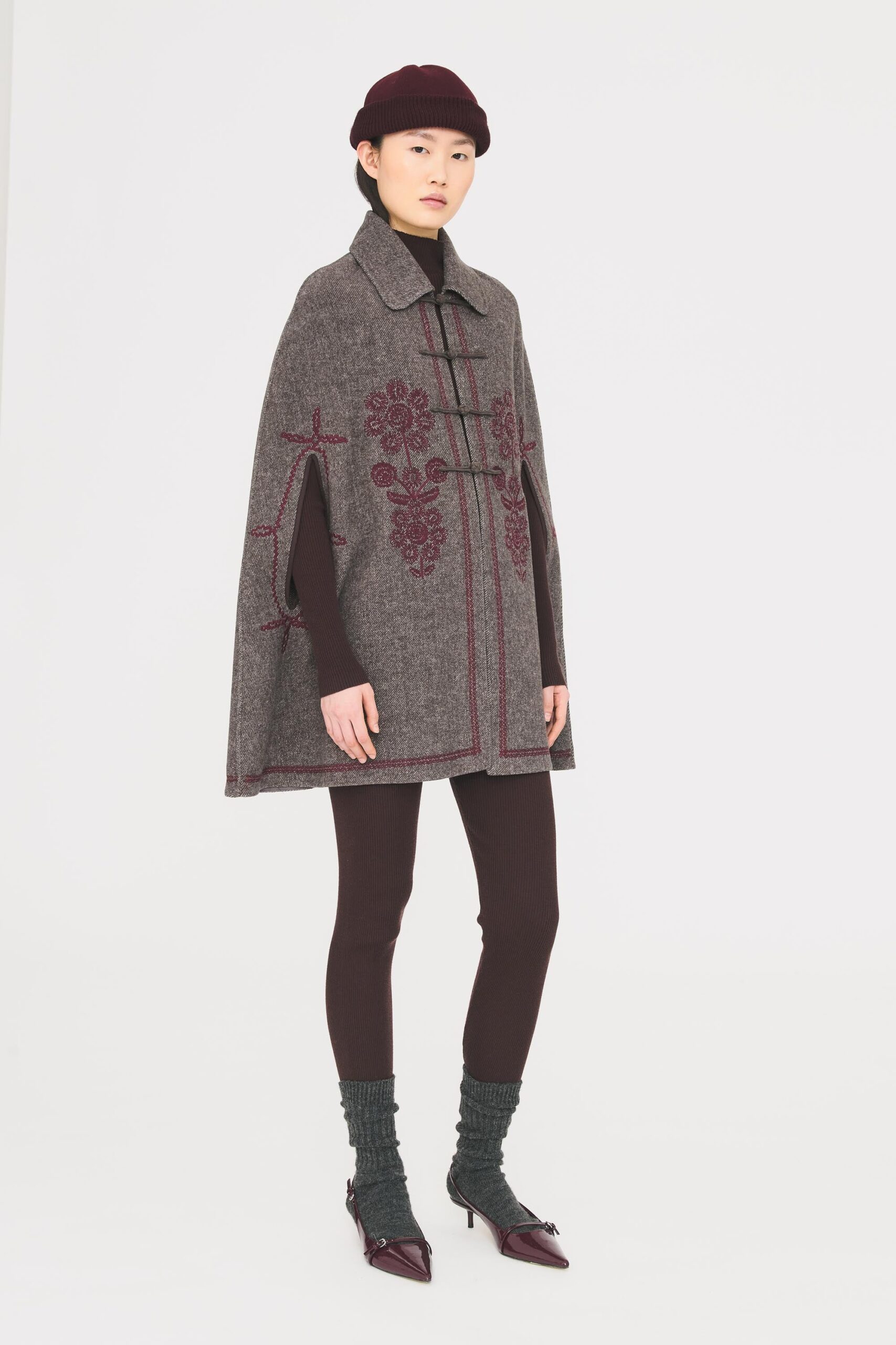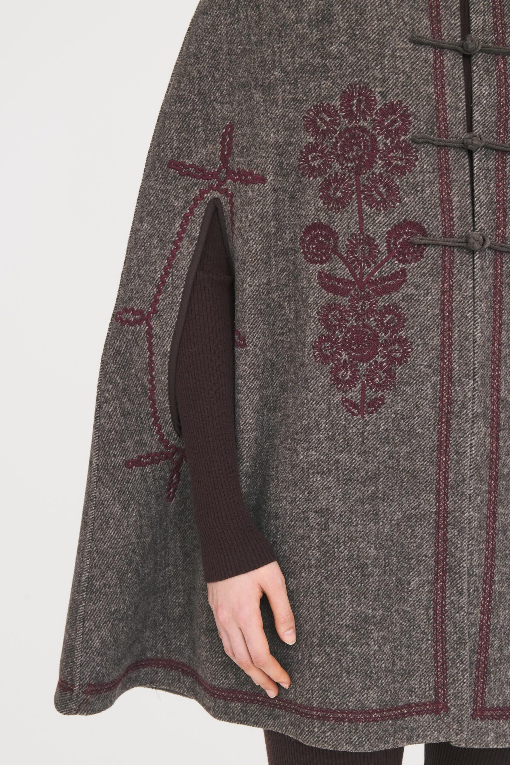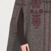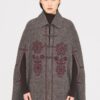 Cappa in misto lana. Vestibilità ampia e fluida. Colletto camicia classico. Chiusura con bottoni in lana. Fessure laterali per il passaggio delle braccia. Ricami floreali bordeaux cuciti sul davanti e sui lati.