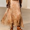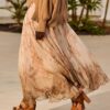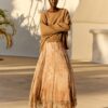 Elegante questa gonna in chiffon di viscosa presenta un delicato motivo floreale in tonnellate di beige poudré. Il suo materiale leggero e trasparente ha creato un doppiopetto in cotone tie & dye, apportando un sottile gioco di sfumature e trasparenza. La cintura elastica assicura un comfort perfetto pur mantenendo un fascino fluido e femminile.