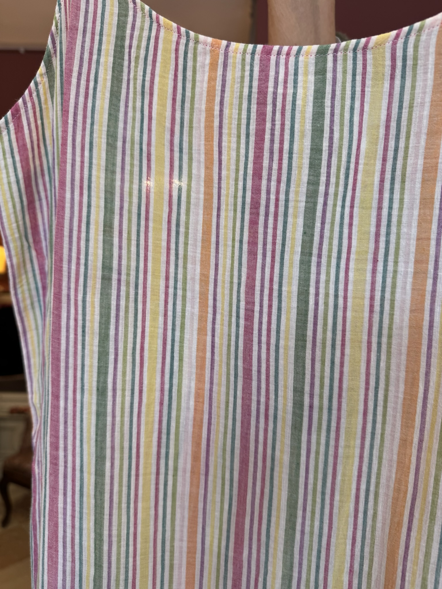 Sottoveste con spalline sottili e tasche. Interamente realizzata a mano, dalla tessitura alla tintura fino alle ultime rifiniture, passando attraverso le mani di artigiani di varie parti dell’India utilizzando abilità e tecniche tradizionali che differiscono da regione a regione.